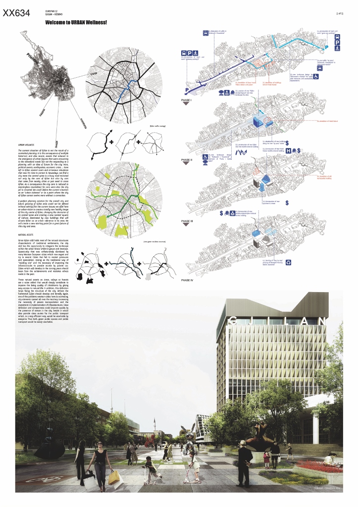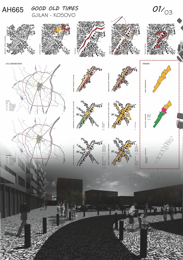 This project gives a phasing proposal of city development. As the other projects it is dealing with public space and 3 proposed buildings as required from the municipality. Traffic is organized that public transport, bicycles and pedestrian movement to be allowed all the way through the axis while car traffic is not diverted to pass in the main square.
