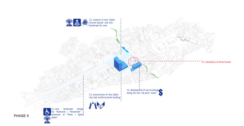 Nobody can offer the perfect planning solution for the overall city and future growing of Gjilan area without solving first the current issues; we offer a urban vision to create a totally new healthy image of Gjilan city, changing the character of its central spine and creating a new Central Square of Culture, dominated by new buildings that will situate Gjilan as a urban reference in its area. We’ll create a new starting point for a great future of this city and area by systematizing its public space.