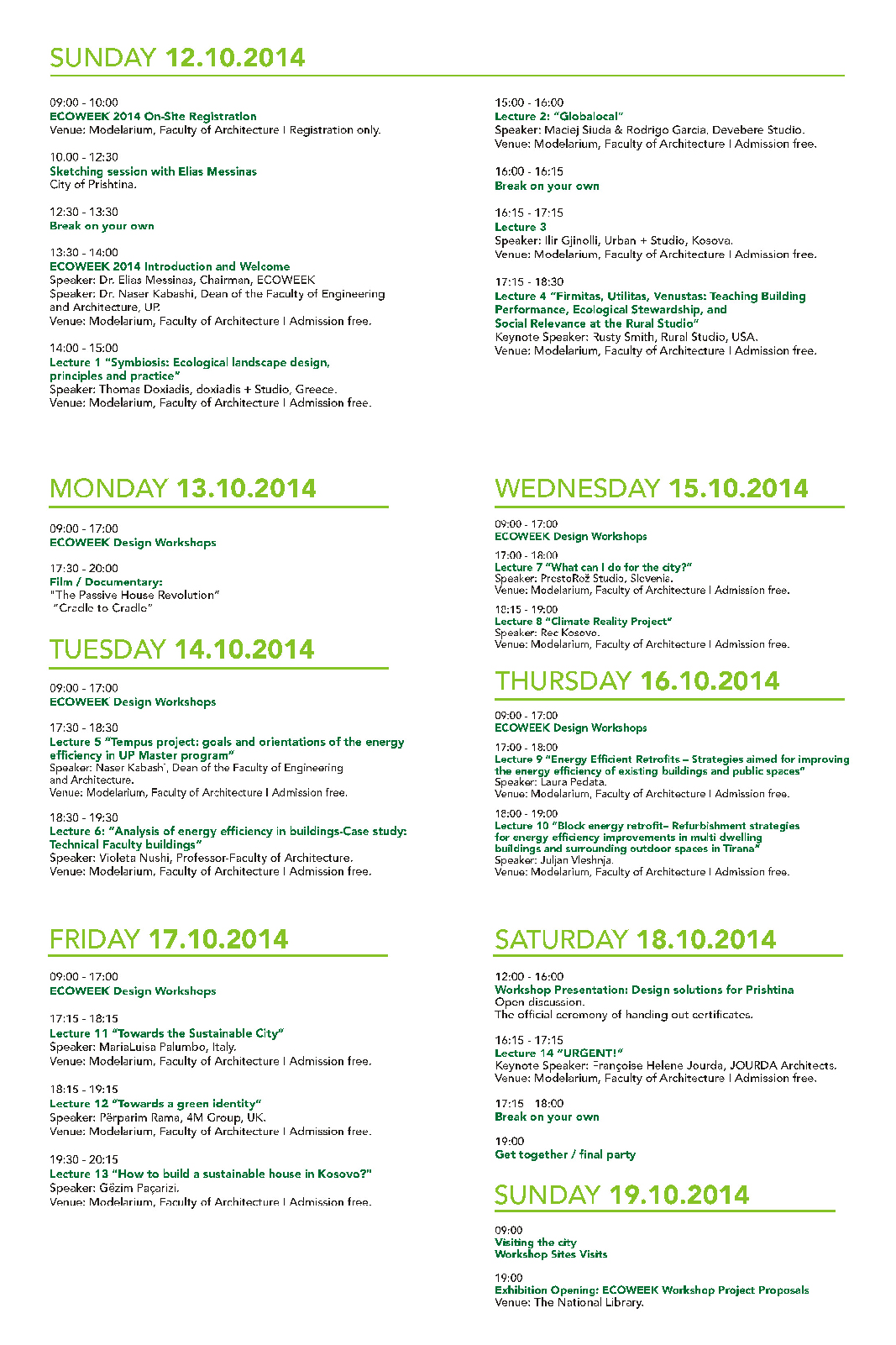 Scheduled to take place this Sunday, with the opening lectures and welcomes at the MODELARIUM of Faculty of Architecture by the Ecoweek chairman Dr. Elias Messinas and Dr. Naser Kabashi, dean of the Faculty of engineering and Architecture – UP.